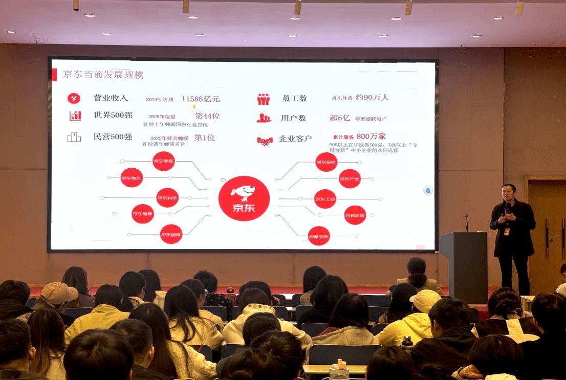 随后,白光泽就公司发展历程、企业文化、业务布局及未来战略规划进行了详细介绍,让同学们对京东的创新活力与行业影响力有了更为全面和深入的认识。白光泽解读了2026届校园招聘计划,详细说明了“专项招聘”与“普通校招”两大途径,以及申请流程和职位需求,为不同专业背景和职业兴趣的同学提供了多元化的选择。白光泽重点介绍了公司2026届校园招聘新锐之星项目。他表示,新锐之星是京东战略性校招人才培养项目,旨在通过一线历练、跟岗学习、管理历练等体系化的培养方案,打造出一支具备京东精神,深耕一线业务,聚焦基层管理的新锐之师 ,该项目为不同岗位方向的毕业生提供了清晰的职业发展路径。