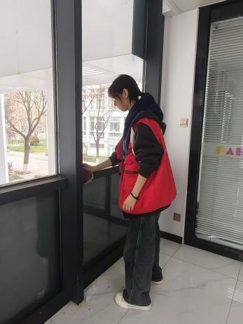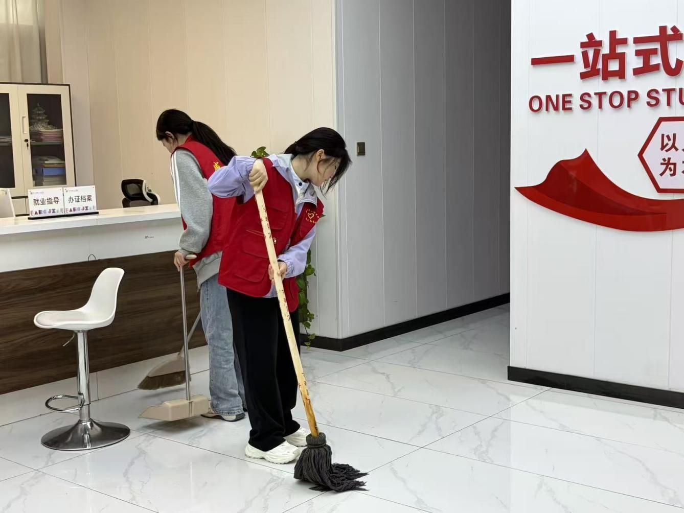 参观学习结束后,志愿者们迅速投入到志愿服务实践中。大家分工明确、协作有序,手持扫帚、拖把、抹布等清洁工具,对一站式学生社区的公共区域进行全面细致的打扫。从地面清洁到书架整理,每一位志愿者都秉持认真负责的态度,用心完成每一项任务,以实际行动营造干净整洁、温馨舒适的服务环境。