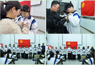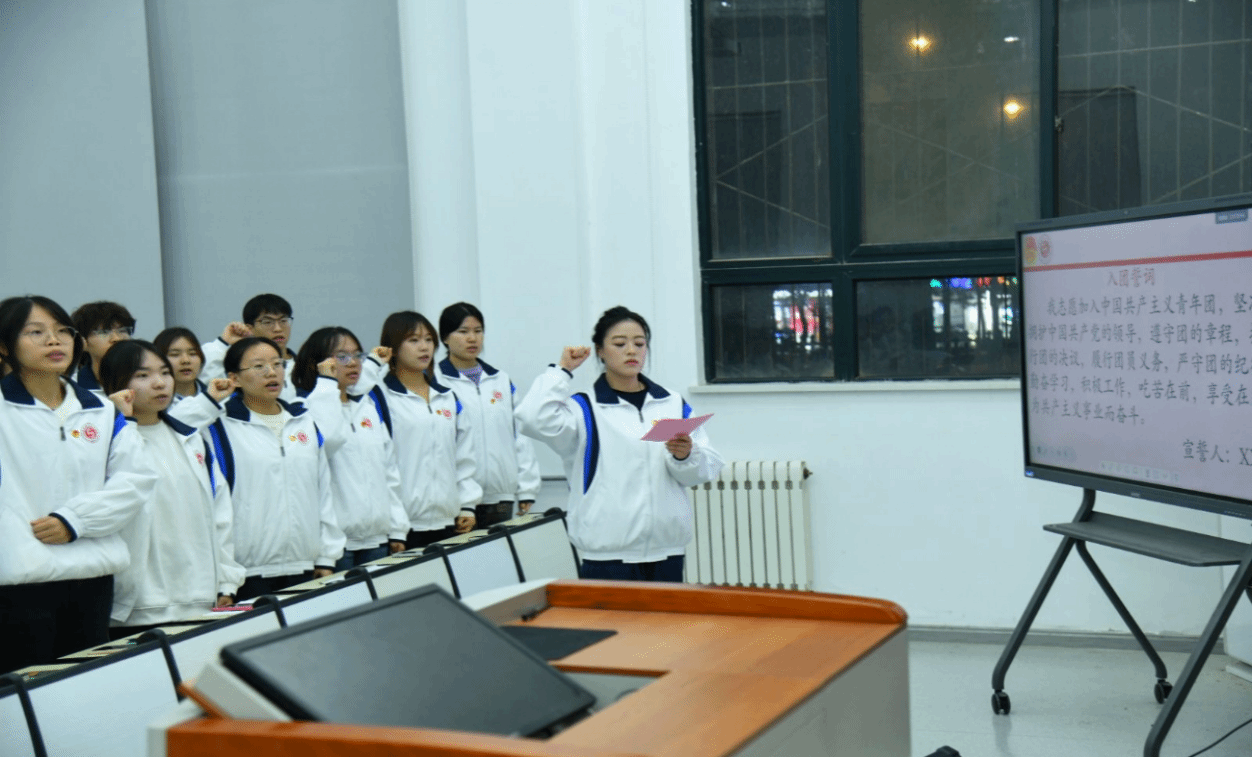 入团宣誓环节将氛围推向高潮,新团员们整齐列队,面向鲜艳夺目的团旗,高举右拳、庄严宣誓。铿锵誓言回荡教室的每一个角落,是对团组织的赤诚承诺,更镌刻着他们矢志跟党走、砥砺奋进的坚定决心。